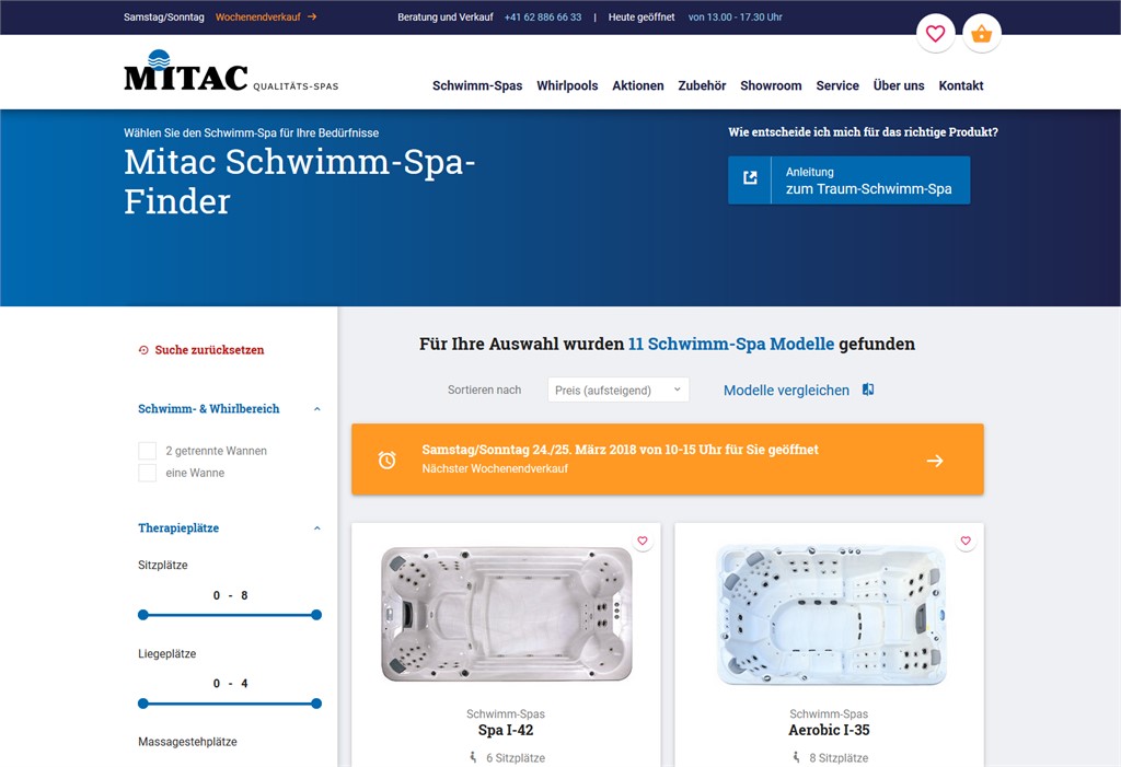 Erfahren Sie alles rund um unsere Schwimmspas, Aktionen und Vorführmodelle. Unsere praktischer Schwimm-Spa-Finder hilft Ihnen bei der Suche nach Ihrer Fitness- und Wohlfühloase. Und neu können Sie neben den Spas auch das dazu passende Zubehör finden und gleich bestellen.