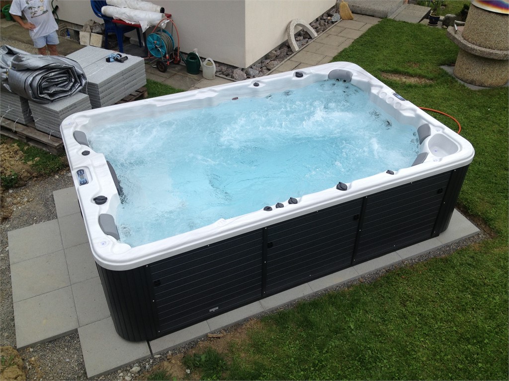 Der klassische Schwimmspa verfügt über Gegenstromdüsen und Sitzplätze mit Massagedüsen in einer Wanne. Die Temperatur fürs Schwimmen wie auch fürs entspannende Bad beträgt in der Regel 25–30° Celsius. So können Sie sich vor oder nach dem Aquatraining auf einen der Hydrotherapieplätzen setzen und sich von den Massagedüsen massieren lassen. Das ermöglicht ganzjähriges Wellnessvergnügen und Aquatraining im eigenen Zuhause.